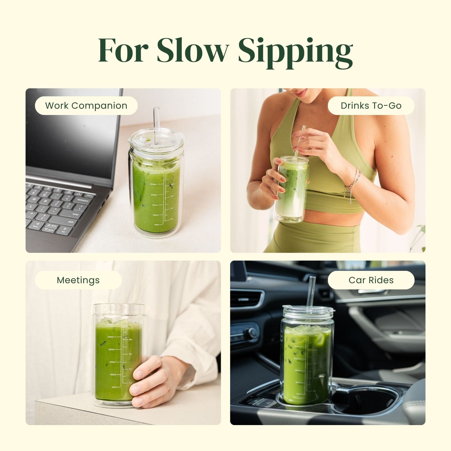 Elevate your Matcha experience on the go with our Slow Sippin' Double-Walled Glass Tumbler - perfect for the office or in your car.